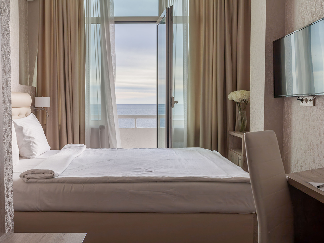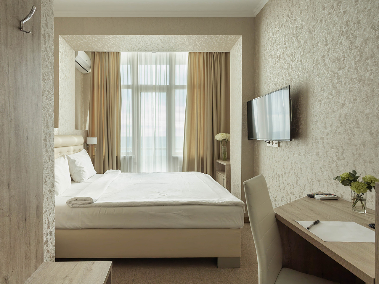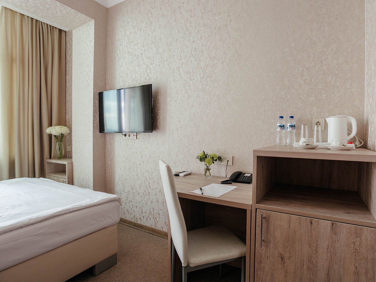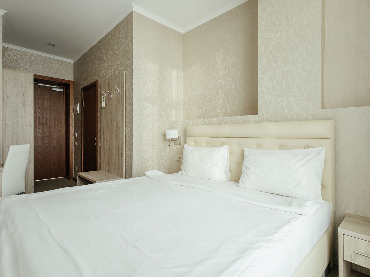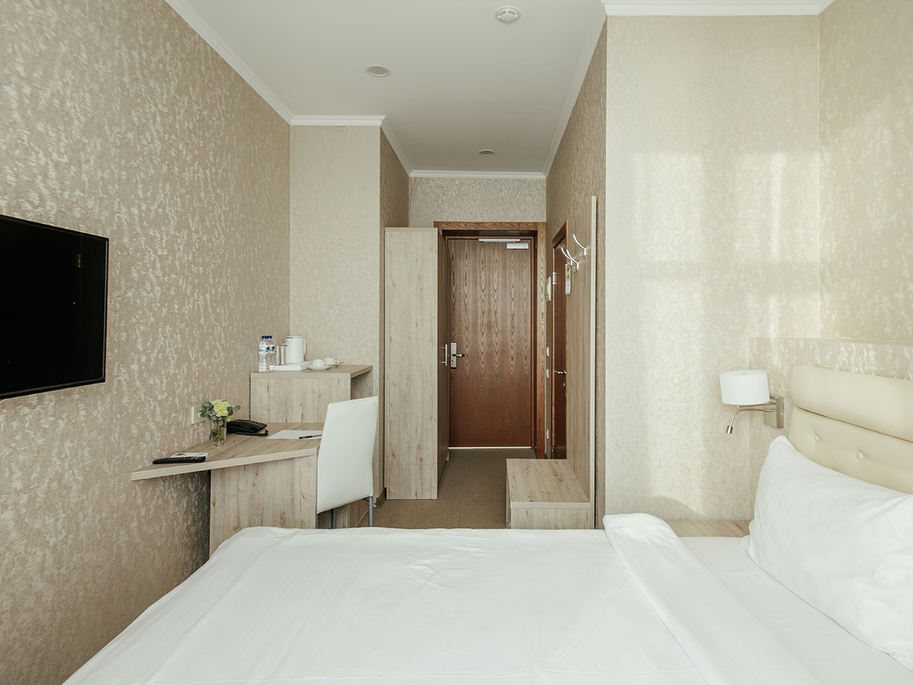 Удобный классический однокомнатный номер отлично подойдёт для одноместного или двухместного размещения с раздельными/двуспальной кроватями, а также для семейной пары с маленьким ребёнком до 3 лет включительно.